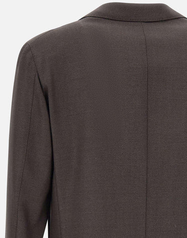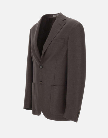 Corneliani men's blazer chocolate brown wool and silk with a textured weave. Featuring a narrow lapel and two-button closure, it has front flap pockets, a pocket square, and an inside pocket. The buttoned cuffs and double back vents enhance tailored style, while viscose lining ensures comfort and lightweight comfort. Fit: Drop 7R.