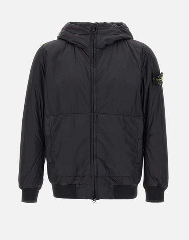 Stone Island "Garment Dyed Crinkle Reps" down jacket in black, crafted from lightweight recycled nylon reps with ultra-dense weave and internal resin coating for wind resistance and light water repellency. Garment dyed for a distinctive finish and padded with PrimaLoft®-TC, a 70% recycled high-performance insulation. Features hood, two-way zip closure, side zip pockets, ribbed cuffs and hem, and internal pocket. Finished with the iconic Stone Island sleeve badge. Regular fit.