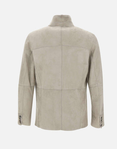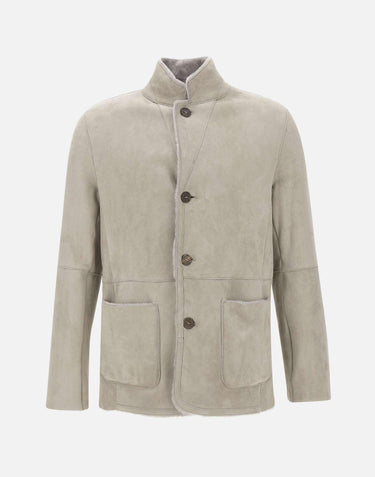 GMS75 "Merinillo" men's suede sheepskin jacket, grey colour, soft and precious, central closure with buttons, front pockets, internal pocket, tailored construction, fur lining, regular fit, made in Italy.
