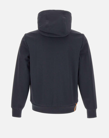RRD men's "Surflex Winter Thermo Hood Zip Jkt" navy blue jacket with a minimalist cut and super matte look. Made from stretch SURFLEX® fabric with a breathable, cold-resistant, and waterproof Stratofabric#3 membrane, it features a fixed hood with elastic drawstring, a magnetic zip fastening, and side pockets with heat-sealed zips. Warm velvet lining with a vertical pocket with an invisible zip, double orange welt, and a "Made with love, designed in Tuscany" tag. Black micro-injected logo on the left sleeve.