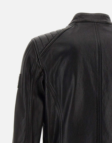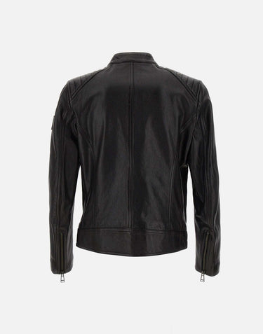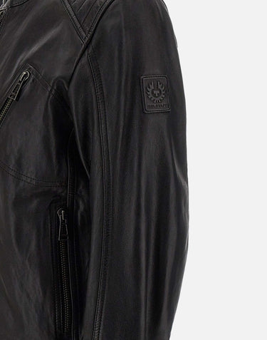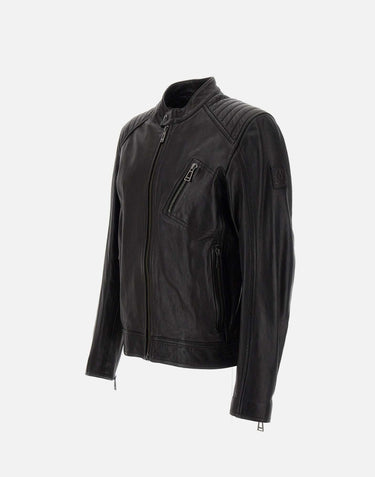Belstaff "V-racer" men's black colour cheviot lambskin jacket, 60s icon, reinforced panels that ensure maximum resistance, water repellent, collar with snap button, shoulders with reinforcements on parallel seams,central front zip closure, zip pocket on chest, side zip pockets, internal pocket, leather phoenix patch on left sleeve, regular fit. Belstaff leather products support responsible manufacturing through the Leather Working Group.