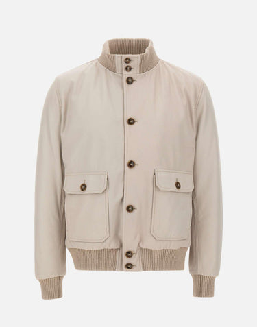 Barba's "Vermont" men's jacket premium, ultra-soft leather, comes an elegant cream shade. The ribbed collar and hems provide comfort and a sporty touch. Contrasting logo buttons add character to design. Large front pockets with flaps and buttons. Lined and enriched with eco-friendly padding for warmth and lightness. Regular fit, Made in Italy, a symbol of craftsmanship and timeless quality.