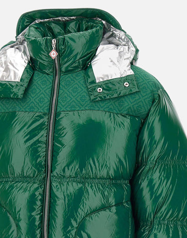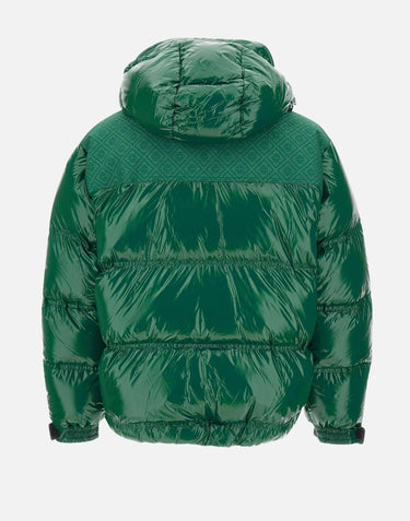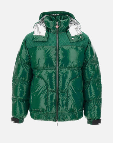 Men’s Casablanca "Nylon Puffer Jacket", presented in green with a modern, boxy silhouette. Crafted from ripstop nylon with down padding, it features a refined contrasting jacquard panel with monogram detail across shoulders. The design includes a hood metal silver color internal with CC logo cord stopper and adjustable drawstring, high collar, zip closure with diamond-logo puller, and front zip pockets. Adjustable cuffs with logo detail and elasticated trims on hem and cuffs complete look. Dry clean only. Relaxed fit. Made in Italy.