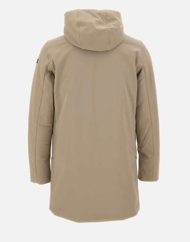 RRD "Surflex Winter Eskimo Jkt" men's sand parka with an Eskimo design revisited with a high-tech and minimalist twist. Made from stretch SURFLEX® fabric with a waterproof and breathable Stratofabric#3 membrane, it offers lightweight comfort and protection from the cold. It features a fixed, padded hood, a front flap with metal buttons that conceals the two-way zipper, and side welt pockets with invisible zippers. 90/10 duck down padding contained in anti-leak tubular channels. Two internal pockets and a black micro-injected logo on the left sleeve.