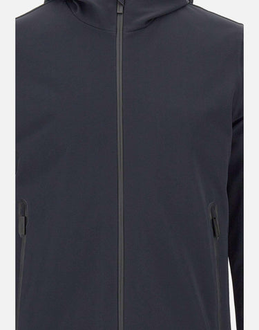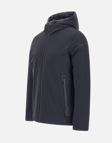 RRD men's "Surflex Winter Storm Jkt" navy blue jacket with a modern, minimalist design, crafted from stretch SURFLEX fabric with a breathable, waterproof Stratofabric #3 membrane. Regular fit with a fixed hood, 90% duck down padding for lightweight warmth, and heat-sealed seams to prevent feathers from escaping. Contrasting front closure and large side pockets with heat-sealed zips. Interior features a concealed zip pocket with double fluorescent orange piping, a "Made with love, designed in Tuscany" tag, and a black micro-injected logo on the left sleeve.