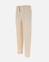 Pantaloni Boss "Tecarino" in velluto a coste di misto cotone color panna. Modello dritto alla caviglia, con vita regolare e passanti per cintura. Chiusura con bottone e zip, pieghe frontali, tasche alla francese e tasche posteriori a filetto. Fondo da 19 cm per un look essenziale e versatile. Regular fit, perfetti per uneleganza casual contemporanea.