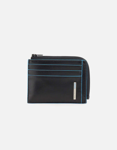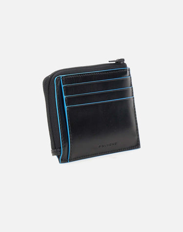 Piquadro leather card holder, black color with iconic turquoise profiles, coin, document and credit card holder with RFID anti-fraud protection, mini metal logo on the front, zip pocket. Measurements: height 8cm, length 11cm.