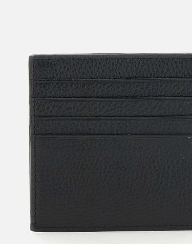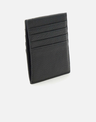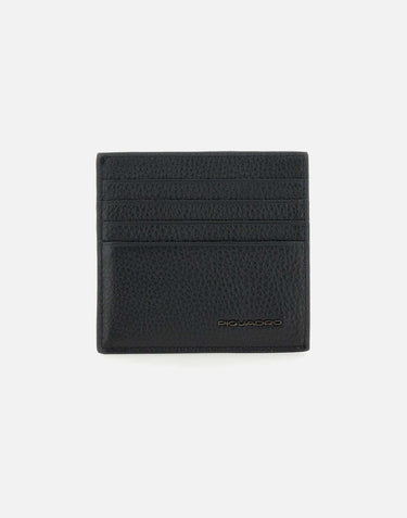 Piquadro grained leather card holder, black colour, eight card slots, tone-on-tone embossed mini logo, side opening for banknotes, RFID Protection, measurements: 10cm high, 10cm long.