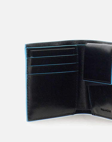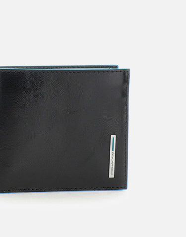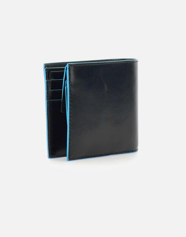 Piquadro Blue Square Special men's leather wallet, black with blue piping, coin pocket with button,credit card compartments, large bill compartments, embossed logo inside, metal logo on front, width 11cm, height 9cm, depth 2cm. Rfid Protected system.