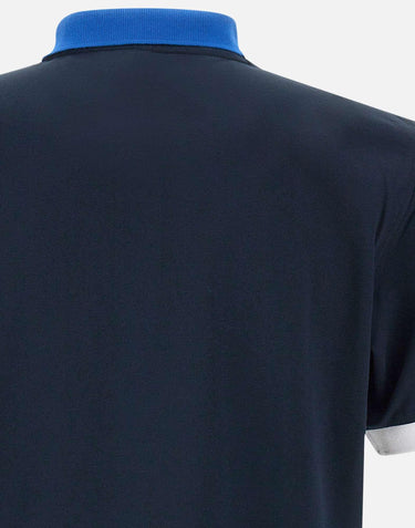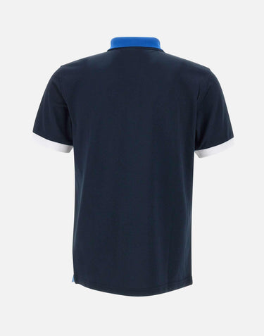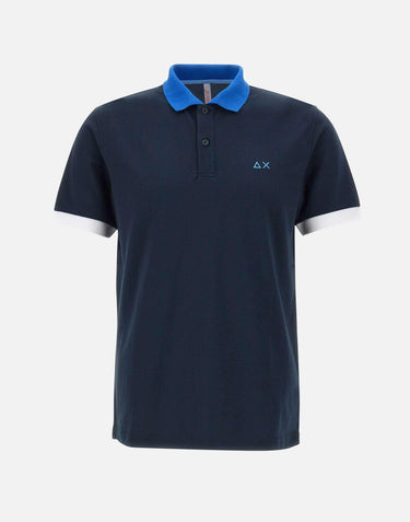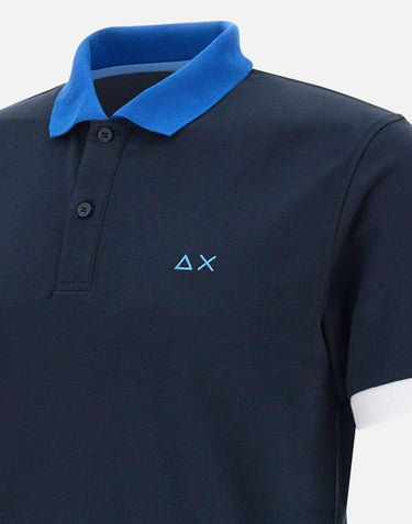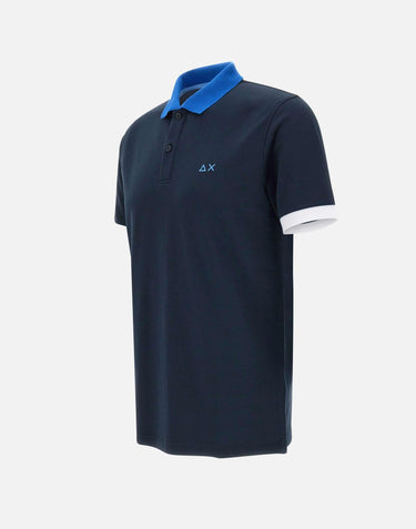 Sun68 "3 color way" men's stretch pique cotton t-shirt, navy blue, short sleeves, classic collar closed by matching logo buttons, ribbed edges, contrasting color profiles, mini slits at hem, embroidered logo on chest, regular fit