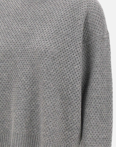Fabiana Filippi wool, silk and cashmere sweater, mèlange grey, crew neck, long sleeves, ribbed hems and honeycomb weave, super soft perfect for cold season, regular fit, made in Italy.