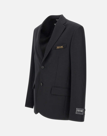 Versace Jeans Couture men's sustained crepe blazer, black colour, collar with lapel, closure with matching buttons with logo, cuffs with buttons, viscose blend lining, front pockets with flap, chest pocket with gold metal logo plate, internal pockets, vent central on back, regular fit. Made in Italy