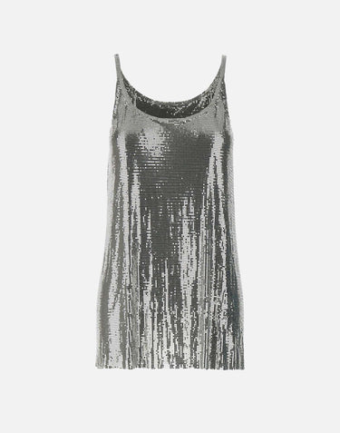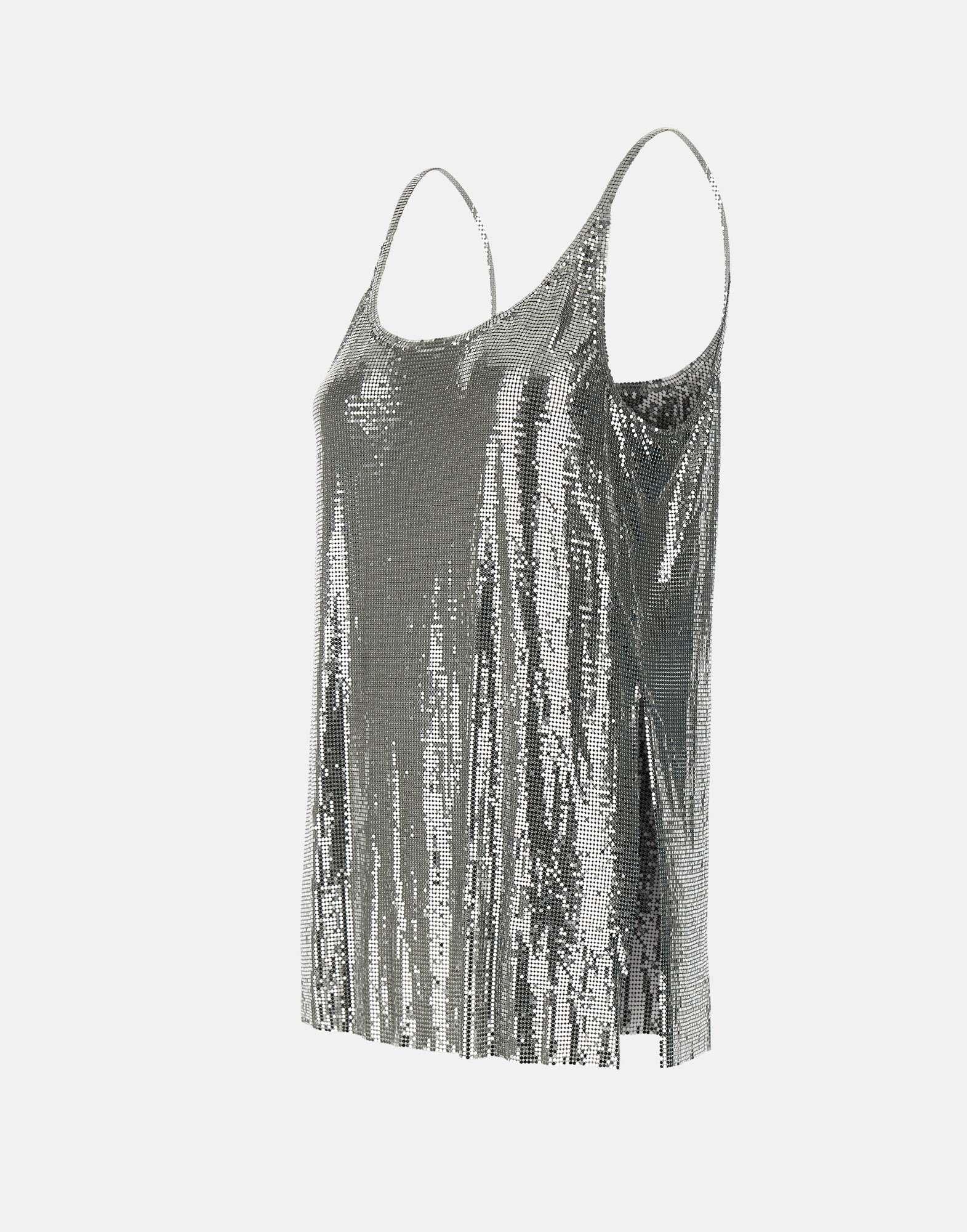 "Silver Mesh Tank Top" Rabanne women's metallic fabric top, silver, thin straps, wide side slits at hem, regular fit