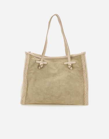 Marcella Club Gianni Chiarini “Marcella” shoulder bag, sand color, stone washed effect fabric material, leather and jute trim, magnetic button closure, single compartment, side logo label, inside pockets, measures: height 31cm, length 38cm, depth 14cm. Made in Italy.