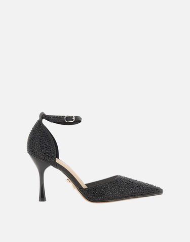 The Twenyfourhaitch "Gruis" pumps are a celebration of bold elegance. Crafted in a refined black with all-over tone-on-tone rhinestones, they combine discreet brilliance with bold character. The pointed-toe silhouette is complemented by an ankle strap for stability and femininity. The 9 cm high, polished heel slims the figure with balance and style, making them perfect for evening occasions and special events.