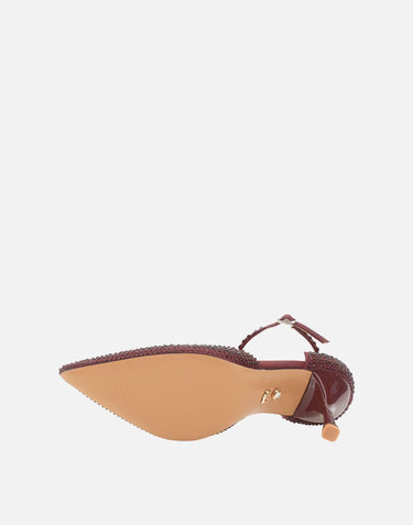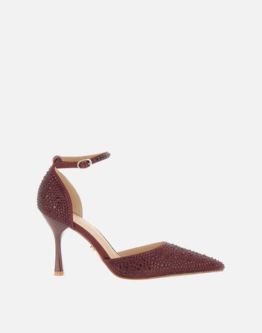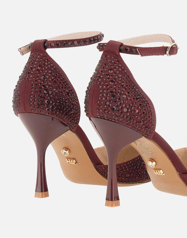 The Twenyfourhaitch "Gruis" pumps are a celebration of bold elegance. Crafted in a refined plum burgundy with all-over tone-on-tone rhinestones, they combine discreet brilliance with bold character. The pointed-toe silhouette is complemented by an ankle strap for stability and femininity. The 9 cm high, polished heel slims the figure with balance and style, making them perfect for evening occasions and special events.