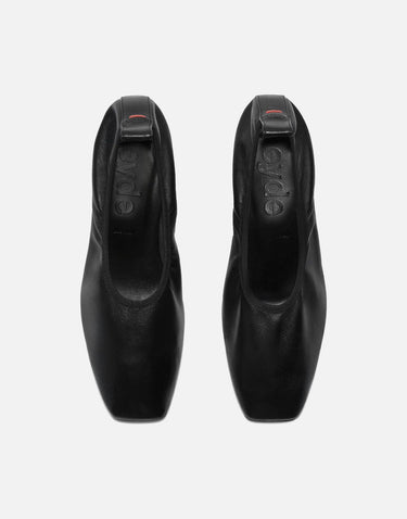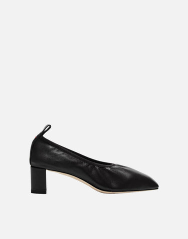 Aeyde women's "Narissa" smooth pumps, black, gathered leather, square toe, elasticated insert, 5cm structured heel, leather sole, pull tab on back, regular fit, made in Italy, case included
