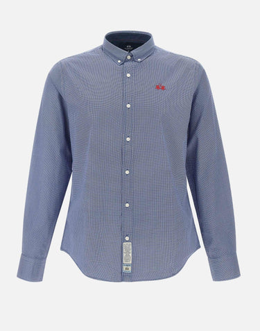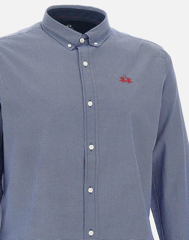 La Martina men's cotton shirt , blue and white micro dot pattern, long sleeves, classic button down collar, button closure and logo label applied to hem, cuffs with buttons, embroidered logo on chest, rounded hem, regular fit.