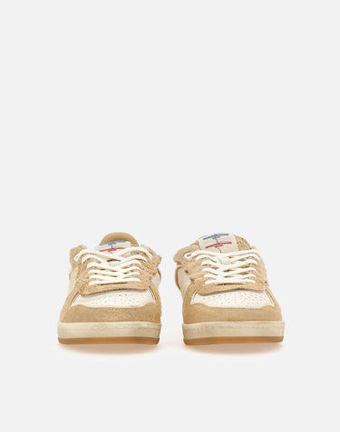 Philippe Model Paris "Pgal Low" men's leather sneakers in white and sand. Special version with distressing, deconstructed double upper, contrasting spoiler and shield, and a customized tongue, matching plasticized detail on side of upper. Leather-covered polyurethane insole for maximum comfort, breathable cotton terry lining, and a customized 3cm rubber outsole. Protective case included. Handcrafted in Italy. Regular fit.