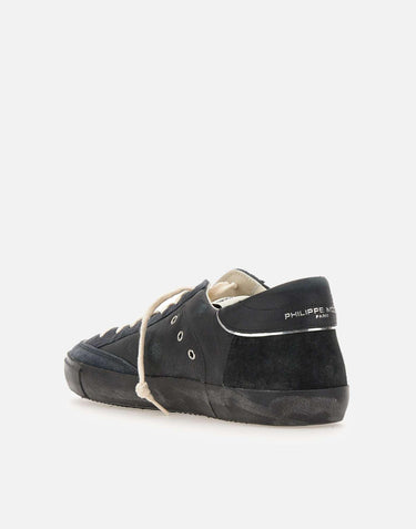 Philippe Model Paris "Prsx low" men's sneakers in midnight blue and black, featuring a super-soft suede upper with a distressed finish and smooth leather inserts, a metallic silver heel tab, iconic shield on the side, side ventilation holes, a logo on the tongue, flat cream cotton laces, a removable logo insole, a leather and cotton terry lining, a logo on the tongue, a 2.5 cm distressed sole, a regular fit, made in Italy. Dust bag included.