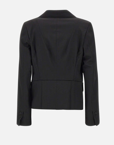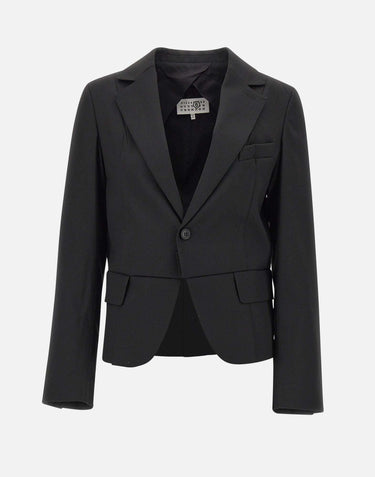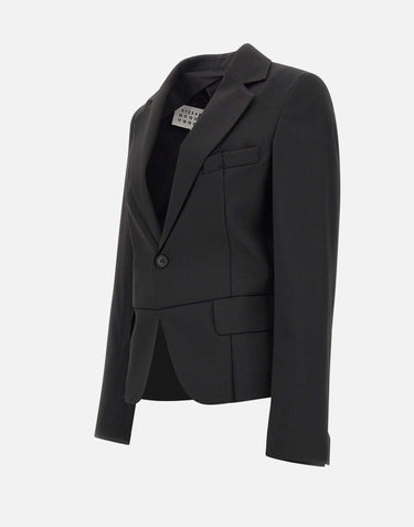 MM6 Maison Margiela stretch viscose blend blazer, black, lapel collar, fastening with a matching button, front pockets with flap, play of tailored cuts to define the silhouette, chest pocket, lined, padded shoulders, slim fit, brand signature inside, made in Italy