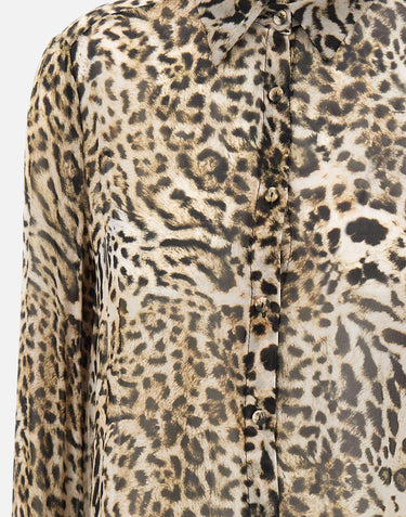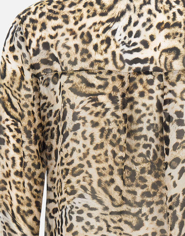 Kaos women's viscose crepe shirt, animal pattern on beige background, long sleeves, classic collar, color-coated button closure, double-button cuffs, relaxed fit, made in Italy