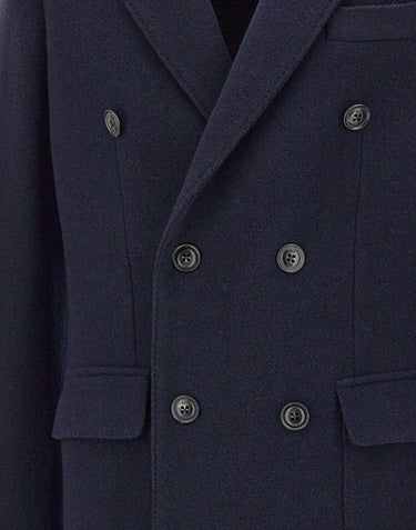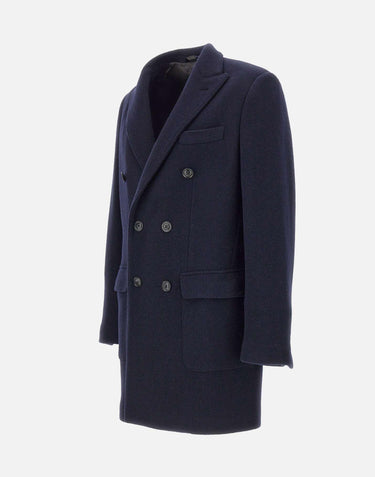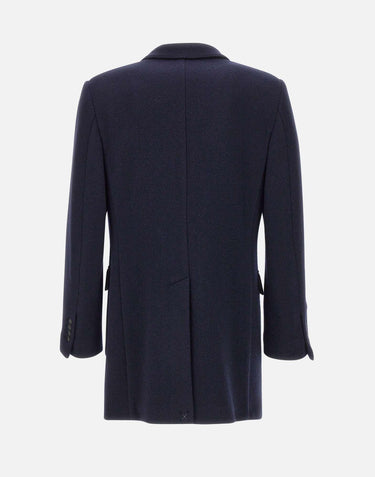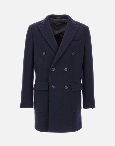 Fay men's coat, blue, wool and nylon jersey, viscose lining, double-breasted closure, peak lapels and split leather undercollar, patch pockets with flaps, pocket square, inside pocket, center back vent, regular fit. Made in Italy. Each Fay product is crafted with special care and attention to detail. To maintain its characteristics and quality over time, we recommend following the washing, drying, and ironing instructions on the label. Dry clean only.