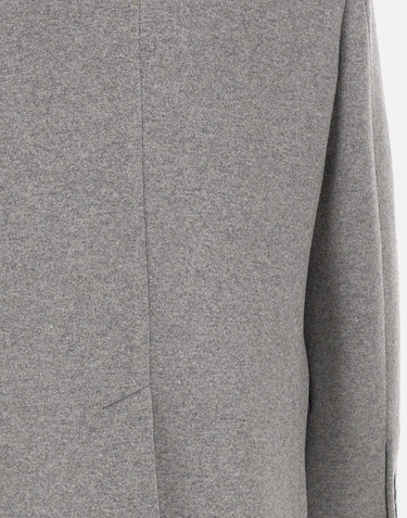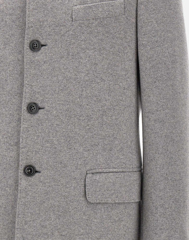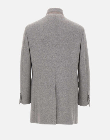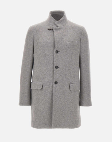 Fay men's gray coat, a seasonal must-have, crafted from yarn-dyed wool blend cloth. It features a stand-up collar, a pocket square, flap pockets, a back vent, tailored details, a signature hook at collar, viscose lining, a horn button closure, a regular fit, and is made in Italy. Each Fay product is crafted with special care and attention to detail. To maintain its characteristics and quality over time, we recommend following washing, drying, and ironing instructions on label.