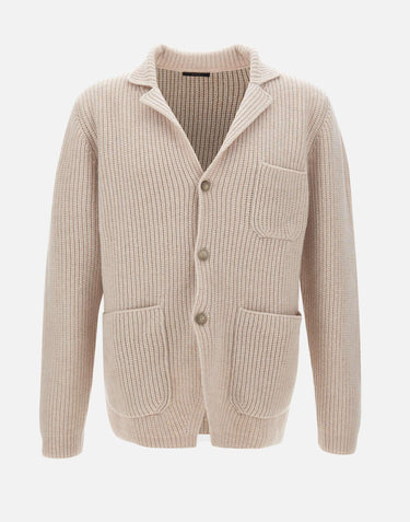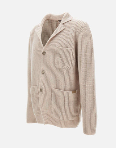 Fay men's 5 gauge wool knit jacket, blue, single-breasted, collar with lapel, pearl rib knit, lower patch pockets with leather patch with Fay logo, chest pocket, button fastening, regular fit. Made in Italy. Hand wash gently cold water without soaking garment