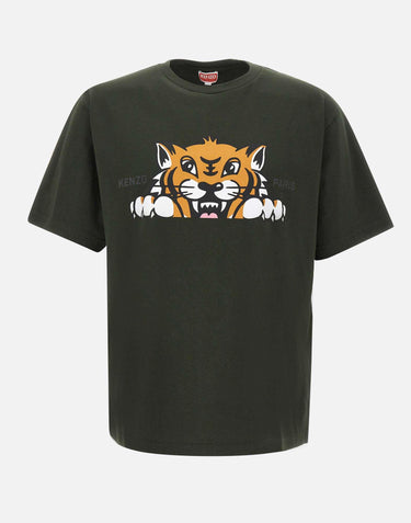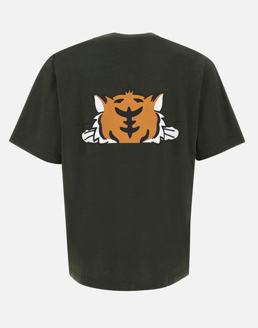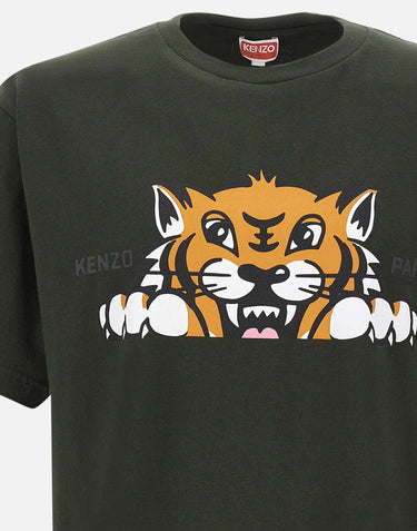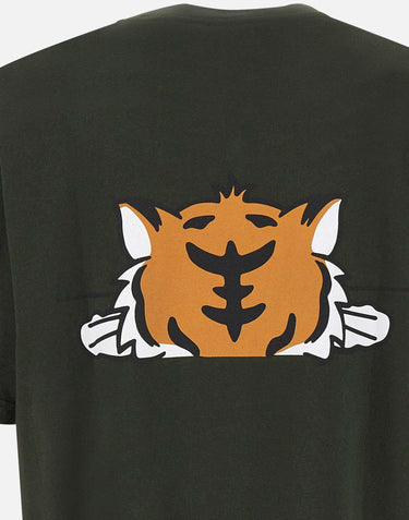 “Happy tiger t-shirt” Kenzo Paris men's, forest green, cotton, short sleeves, crew neck, maxi multicolor logo print front and back, relaxed fit