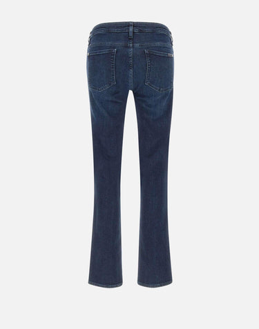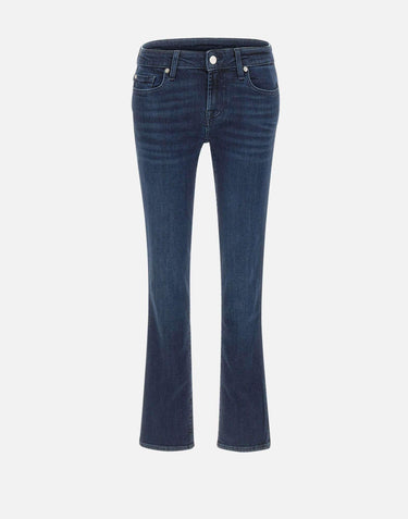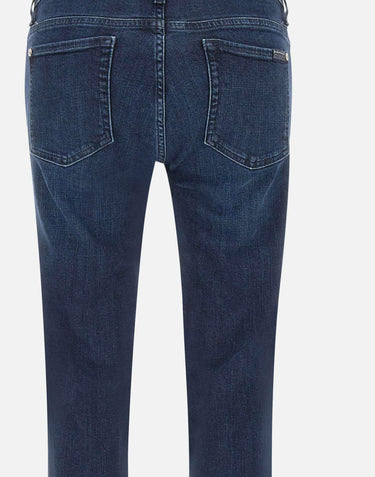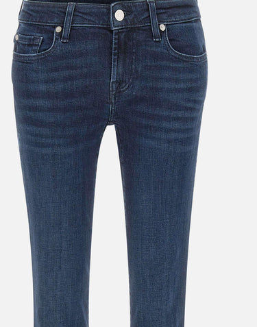 7 For All Mankind "Baltimore" women's jeans, dark wash blue, stretch cotton denim, five pockets, zip and button fastening, low waist with belt loops, slim silhouette effect (Slim Illusion), 17cm hem, skinny fit