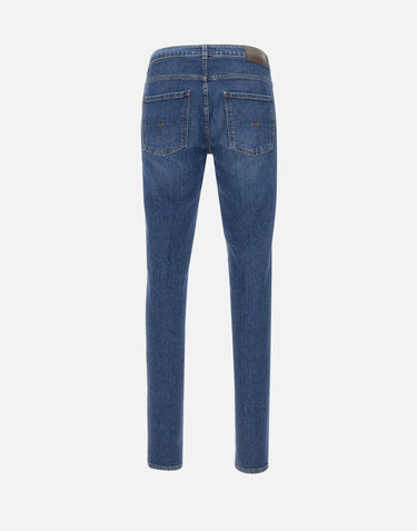 Fay men's dark wash blue, slightly stretch denim jeans, five pockets, leather patch on back, zip and logo button fastening, 17cm hem, slim fit, made in Italy