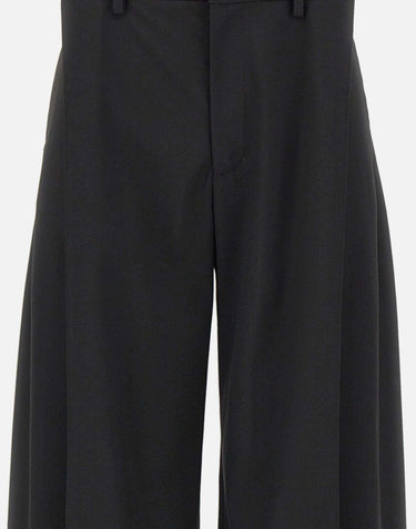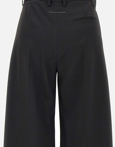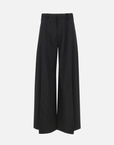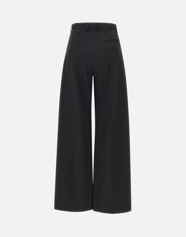 MM6 Maison Margiela woman black stretch viscose blend fabric trousers, tailored construction with a play of "fake" darts that create a moving crease, side welt pockets, back pockets, zip, hook and button fastening, extra wide leg with 27cm bottom, belt loops, regular fit, made in Italy.