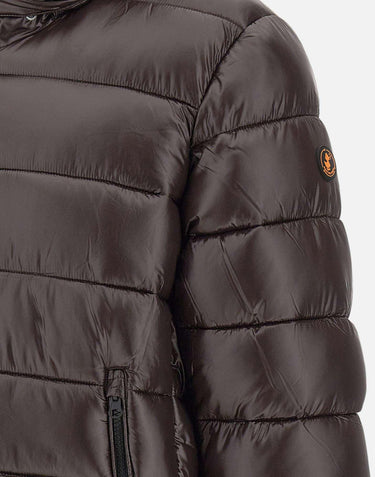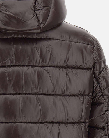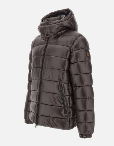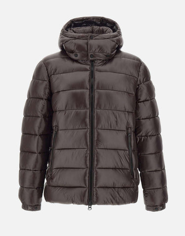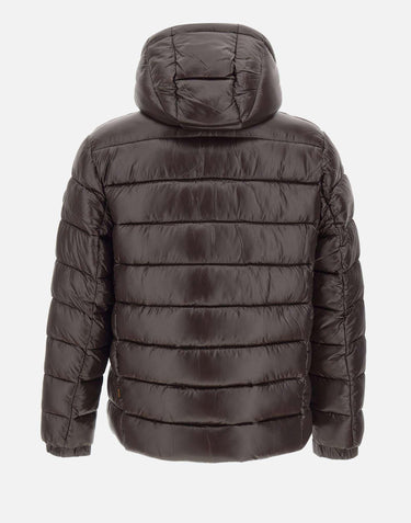 Men's Save The Duck "Florian Love21" puffer jacket in glossy chocolate brown fabric with detachable hood for a versatile look. Filled with 100% Animal Free eco-friendly padding, it provides warmth and lightness while respecting the environment. Horizontal quilting, two-way front zip closure, side zip pockets, and adjustable cuffs with button. Iconic round logo patch on the left sleeve. Storage bag included. Regular fit..