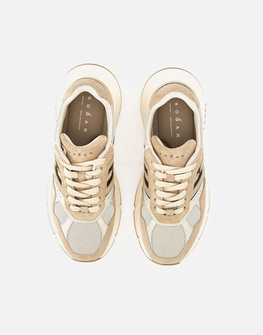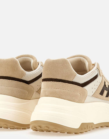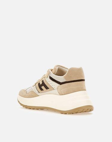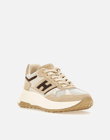 Hogan "H669 Hifi" women's suede sneakers, sand and cream, sporty iconography from 1980s, cut-out H on side, Lycra mesh inserts smooth leather details, 8 mm memory foam insole, Hyperlight platform sole with rubber studs total height 6.5 cm, logo on tongue, flat laces, regular fit, made in Italy. Fabric case included, additional laces.