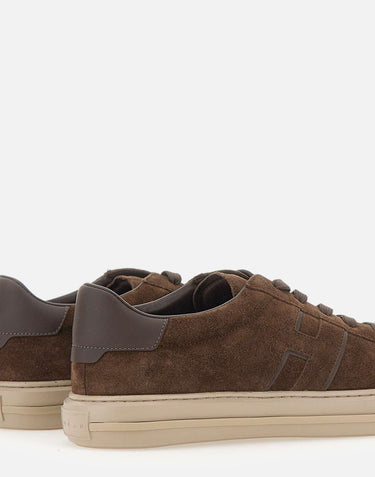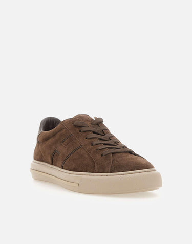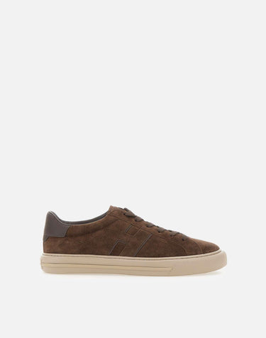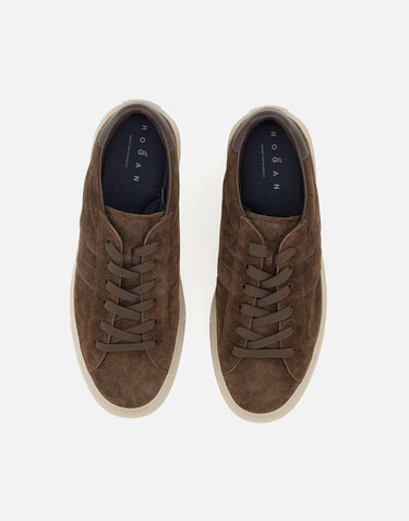 Hogan "H691" men's dark brown suede sneakers inspired by '90s skate sneakers, smooth leather details, flat laces, Hogan monogram on side, embossed logo on tongue, memory foam insole, rubber sole, total height 3.8 cm, regular fit, made in Italy. Fabric case included. UK size 10 corresponds to EU/IT size 44. Convert your size using conversion table: HOGAN MEN'S FOOTWEAR UK