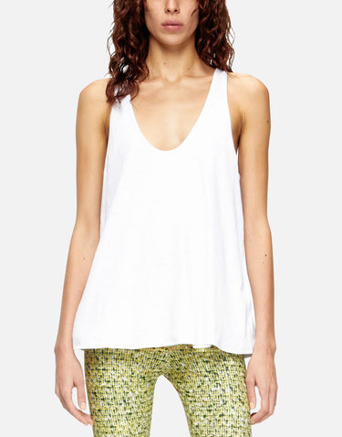 Diesel women's "T-Ipsya LKDS Top" in a ribbed cotton blend, available in a versatile optical white. The design is soft and perfectly fitted, perfect for natural, comfortable movement. The wide shoulder straps and clean cut enhance the simplicity of the piece, made unique by the subtle yet recognizable tone-on-tone embroidered Diesel logo on the chest. A basic piece with a clean, contemporary aesthetic, ideal for completing casual or layering looks.