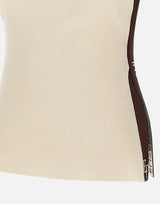 Elisabetta Franchi "Urban" sleeveless crew neck top in cream and chocolate viscose. The shiny viscose bands create a refined contrast in texture, while contrasting inlaid logos add a graphic, contemporary touch. Side slit at the hem for greater movement. Slim fit.