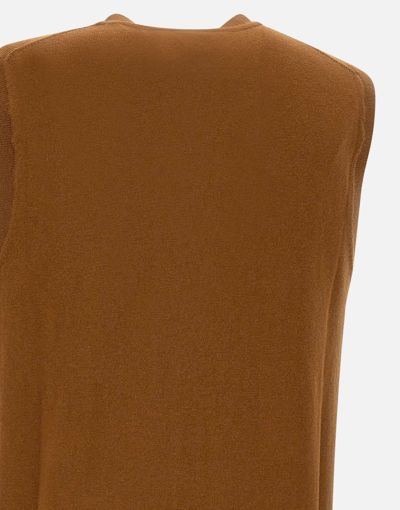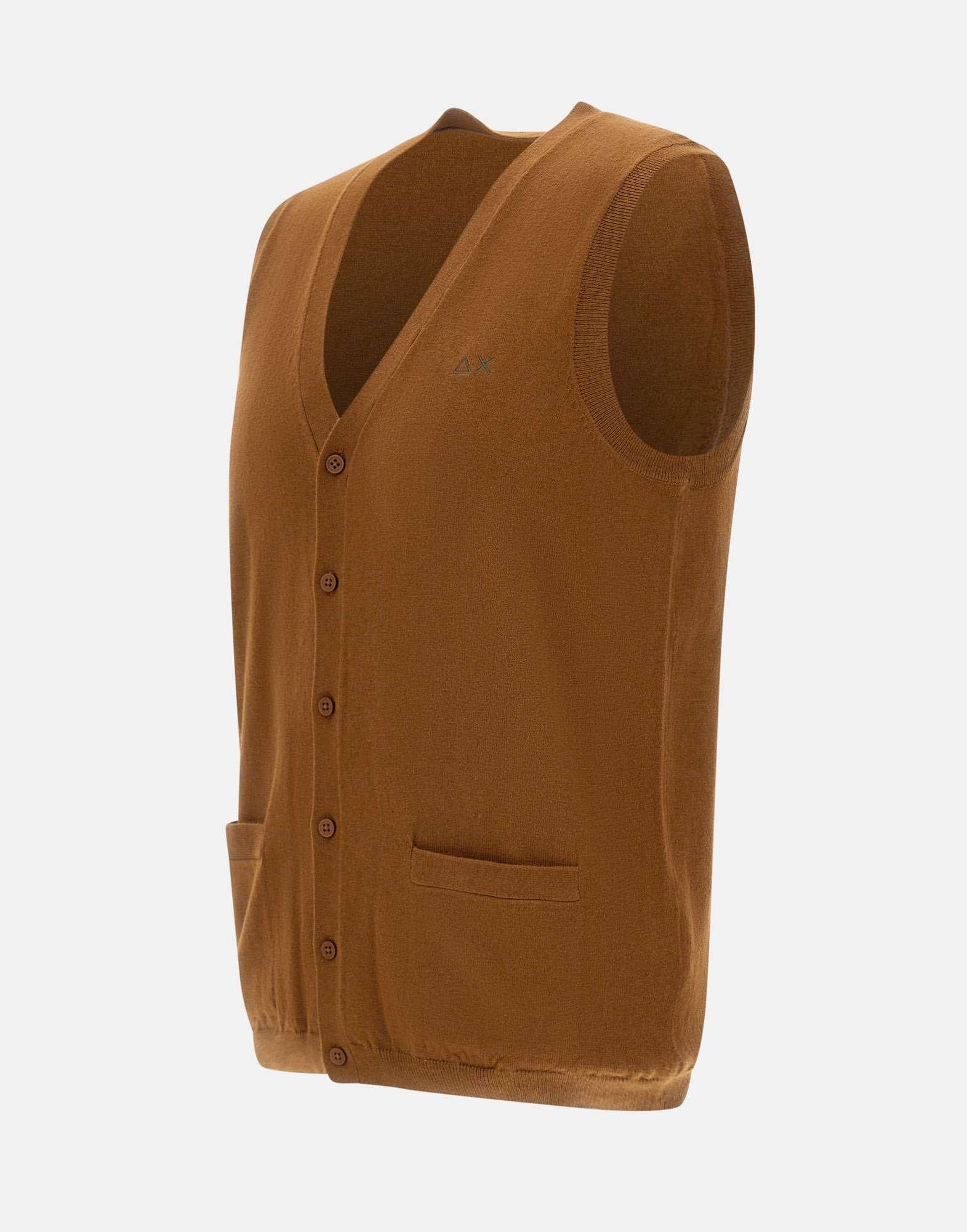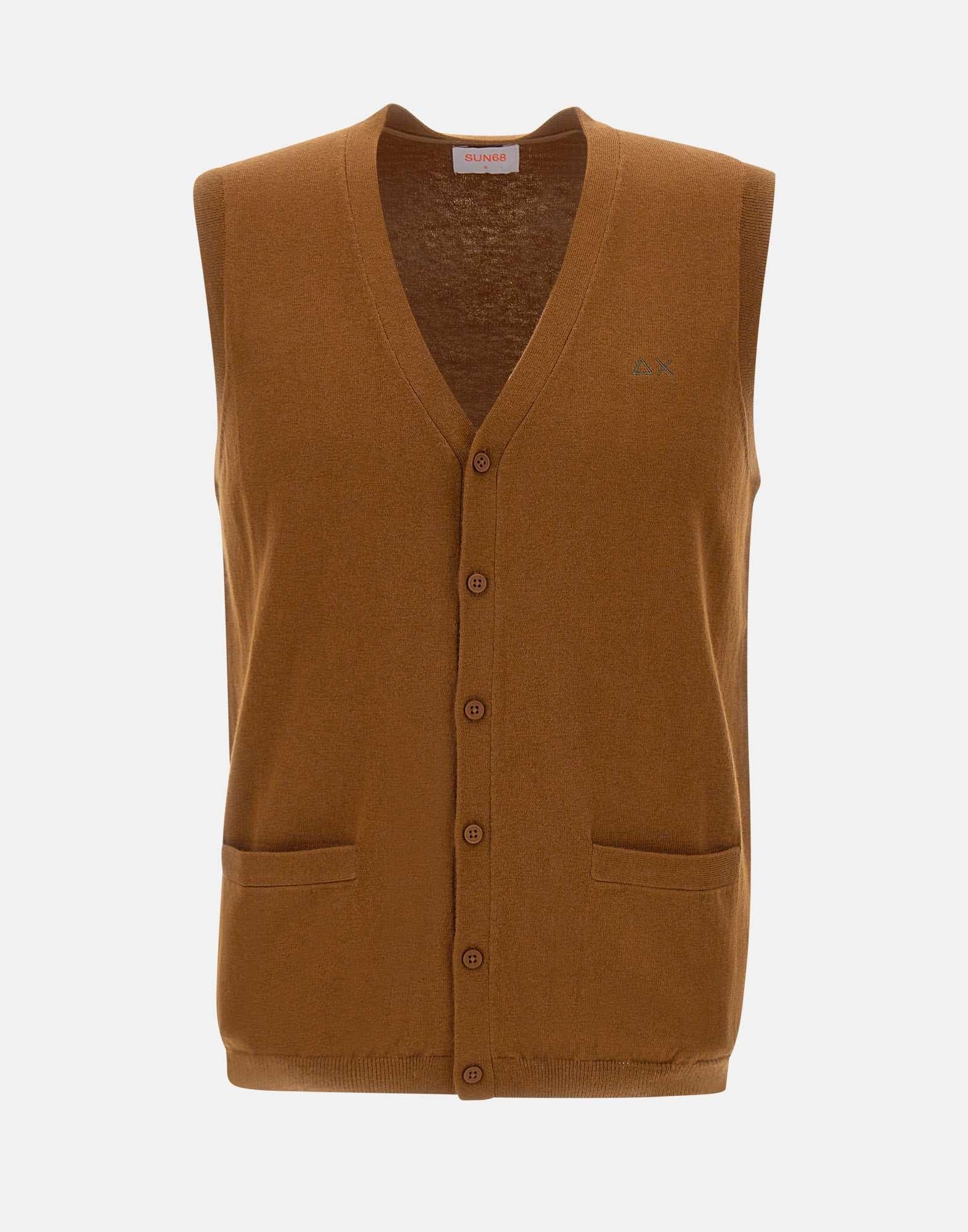 Sun68 "Basic" men's vest from Everyday Collection, made of merino wool and cotton, tobacco, sleeveless, V-neck with contrasting internal stripe, ribbed edges and embroidered logo on chest, front pockets, matching logo button closure, regular fit, perfect for a casual and versatile style.