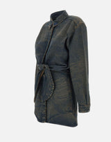 Diesel "De-susan-s dress", midnight blue, interpretation of distinctive stylistic codes of new season of brand, black denim fabric in TENCEL Lyocell with a fluid texture, enriched by lasered whiskers and used details, shirt construction, classic collar with raised Oval D, dropped shoulders, knotted motif at waist, slim skirt with hidden buttons on front, buttoned cuffs, relaxed fit
