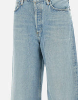 " Dame ’ Agolde made of regenerated cotton denim jeans, light blue, high waist with belt loops, fastening with silver logo buttons, five-pocket model, wide waistband also on hem 33 cm, regular fit.