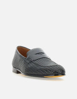 Doucal's Braidy men's leather moccasins, blue, interlaced weave, topstitching, handcrafted visible stitching, logoed leather insole, leather sole, 2cm heel, made in Italy, fabric case included. Regular fit