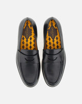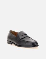 Doucal's "Decò" men's smooth leather moccasins, 50 Years edition with dedicated pack, total black, decorated vamp, visible handcrafted stitching, extra-comfortable interior, rubber and leather sole, 2cm high heel. Made in Italy. Case included.Regular fit