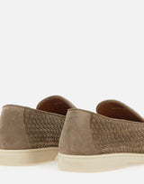 Doucal's men's “Sauvage” suede moccasins with interlaced pattern, taupe, exposed handcrafted topstitching, round toe, logoed leather insole, icing-colored rubber sole, 2cm heel, made in Italy, case included.