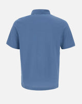 Diktat men's cotton crepe polo shirt, aviator blue, short sleeves, classic collar closed by tone-on-tone mother-of-pearl buttons, mini side slits at hem with applied logo label, regular fit