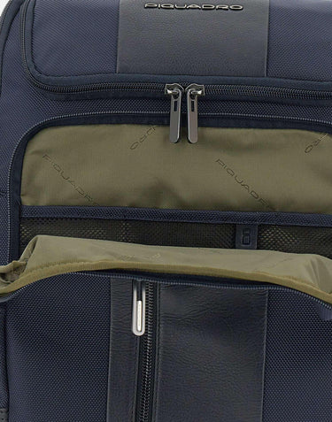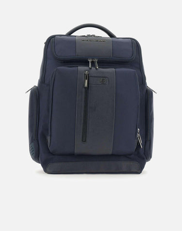 Piquadro blue color, 15.6 laptop case made of recycled fabric and leather backpack, shock and RFID protectors and pocket for AirPods®, two compartments, Shock Absorber, fixed Ipad Pro ® 12.9 holder, fixed handles, badge holder, polyester lining, multi-pockets, sunglasses holder, literage 29, dimensions:34cm length, 43cm height, 19 cm. Weight: 1436g