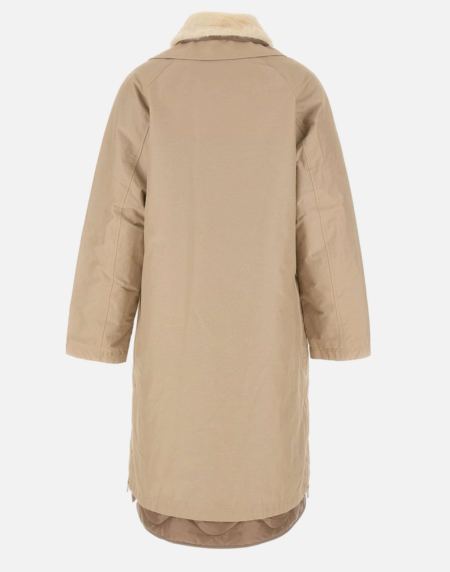 Woolrich "All Weather Coat", sand, 3-in-1 construction, made of water-repellent and wind-resistant Ramar Cloth fabric. It features a shirt collar with faux fur insert, button closure and side pockets. Side zips for a customizable fit. Inside, a removable quilted jacket insulated with PrimaLoft with snap closure and side pockets. Logo label on the left pocket. Comfort fit. Thermal rating: moderate cold (0°C / +10°C).