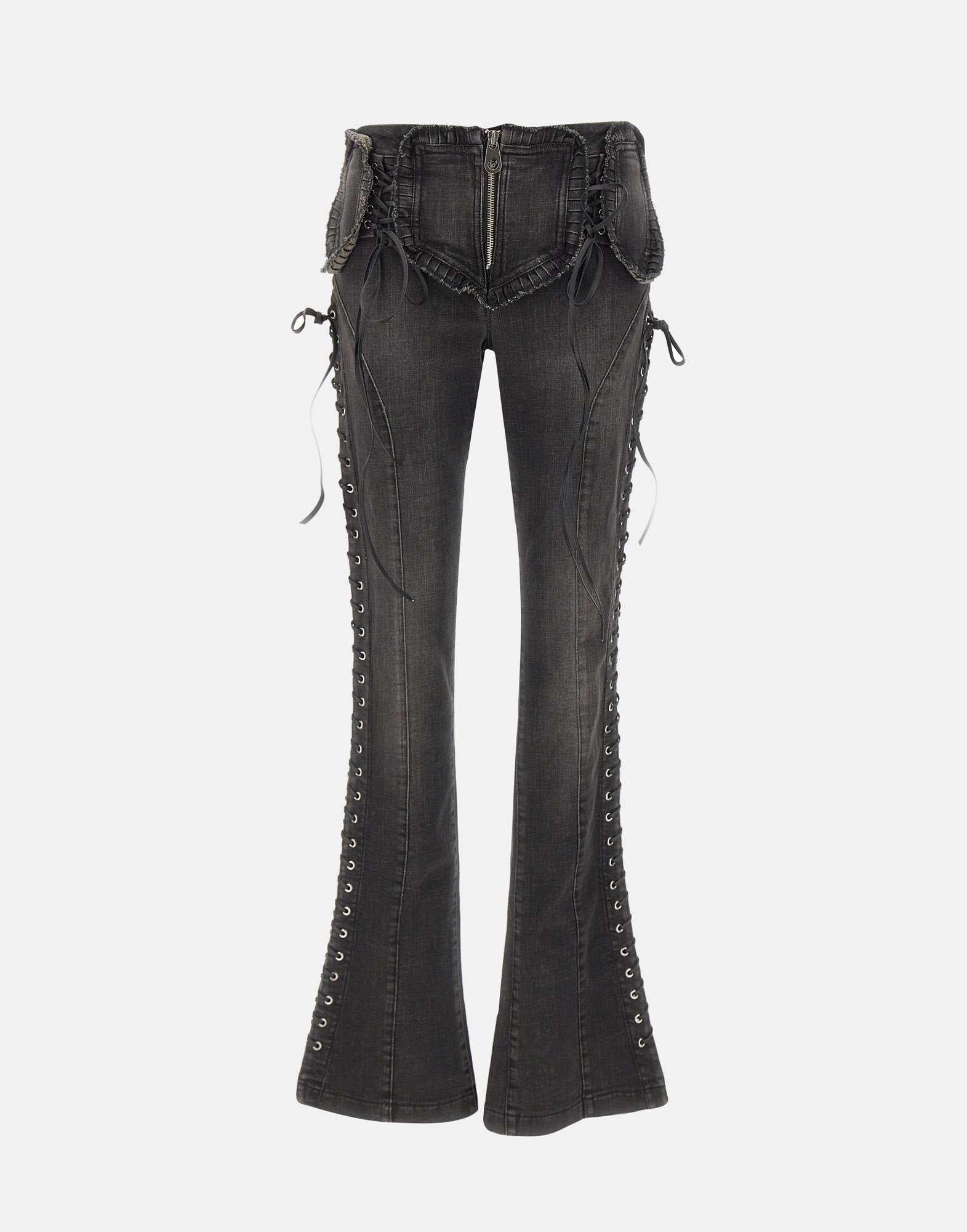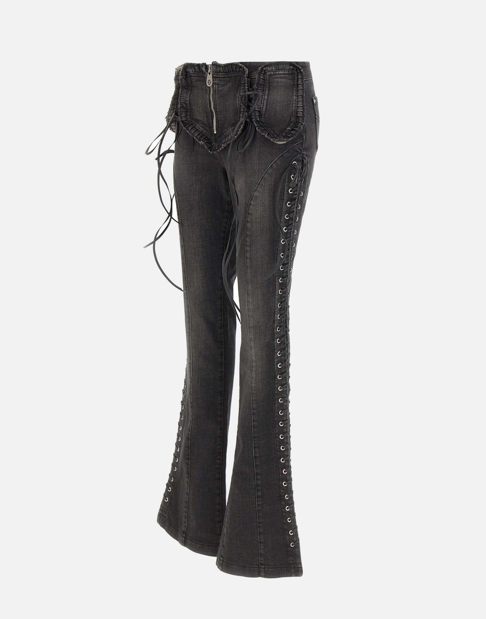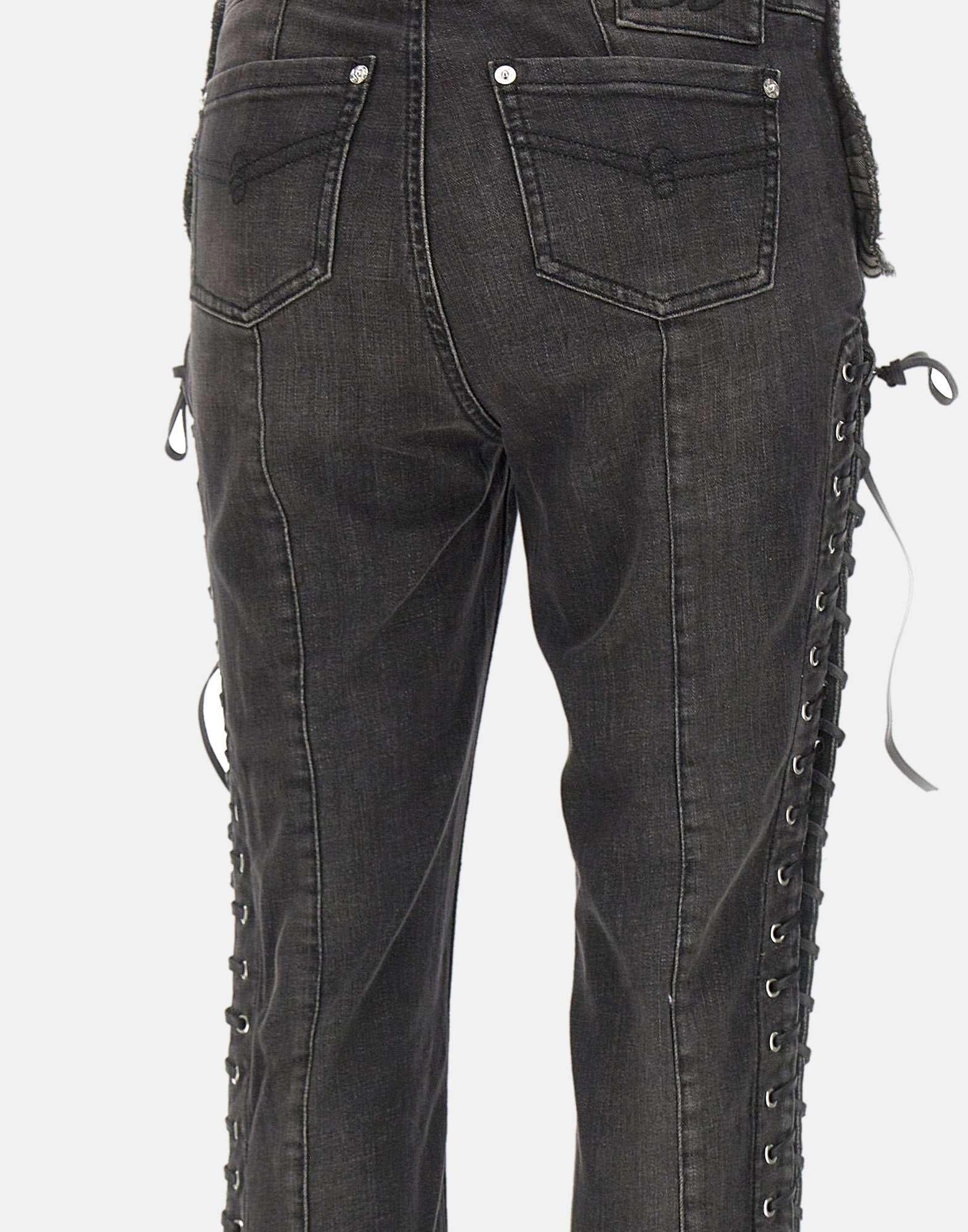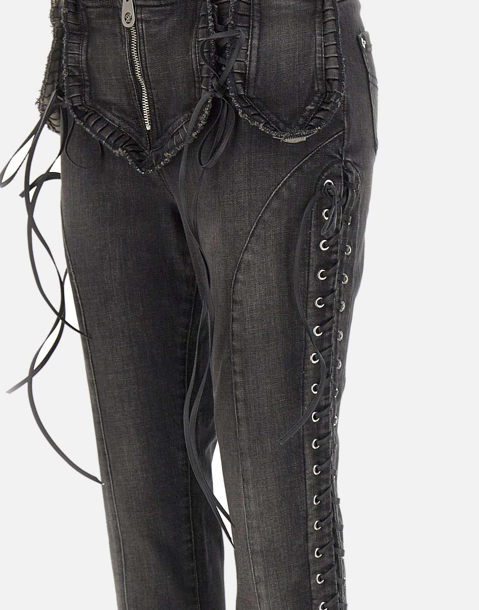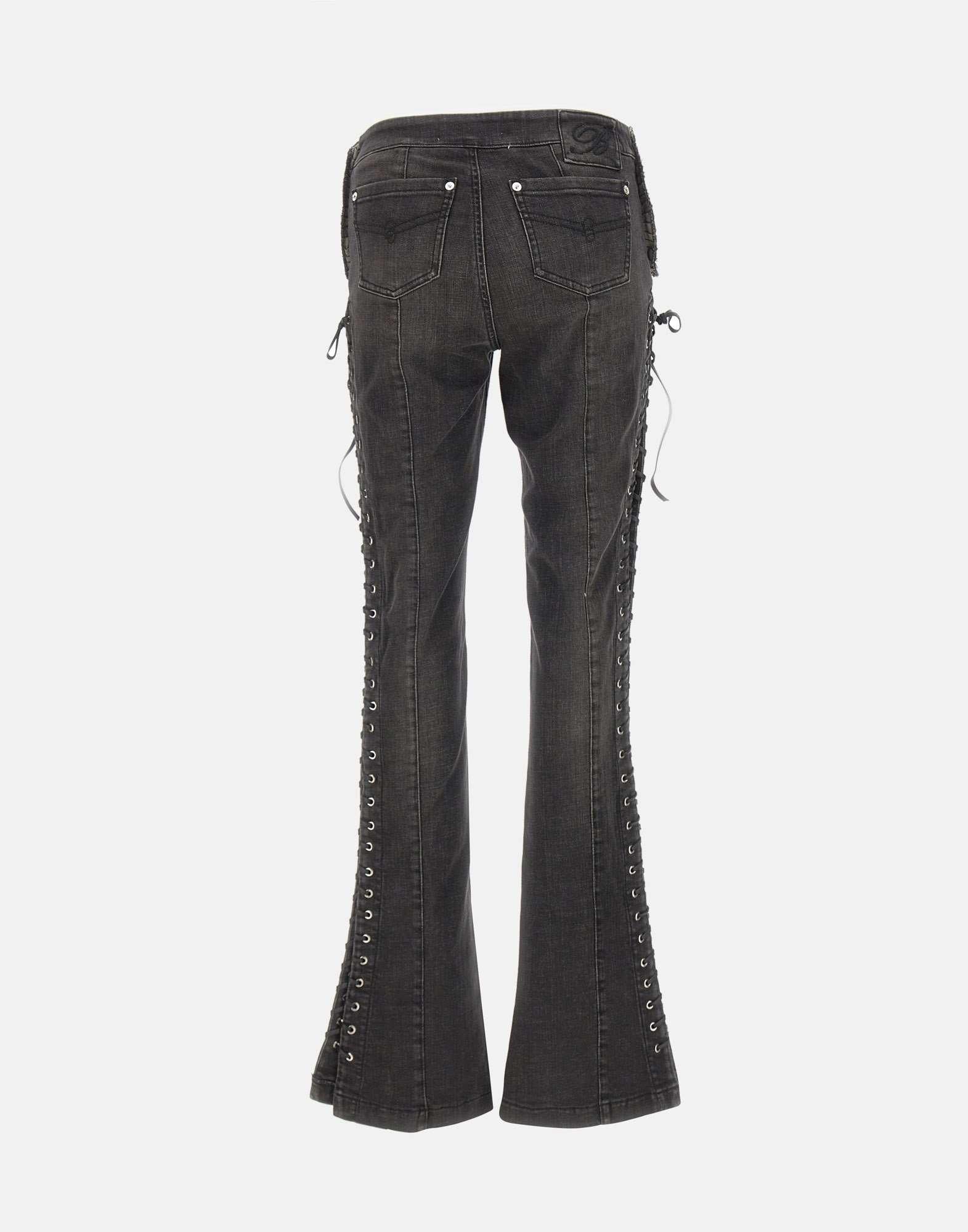 Blumarine jeans in black stretch cotton denim, slim fit, with distinctive raw-edge patches and an eyelet motif with intertwined laces on the front and sides. Zip closure, 23cm puddle hem, patch pockets on the back, and a "B" logo monogram label. An iconic piece for looks with a contemporary and feminine attitude.