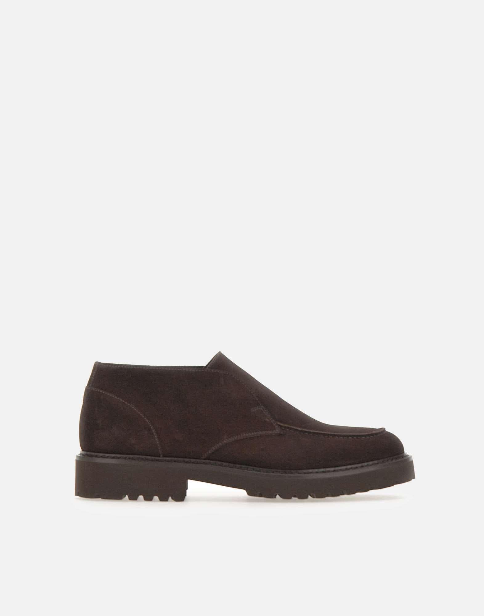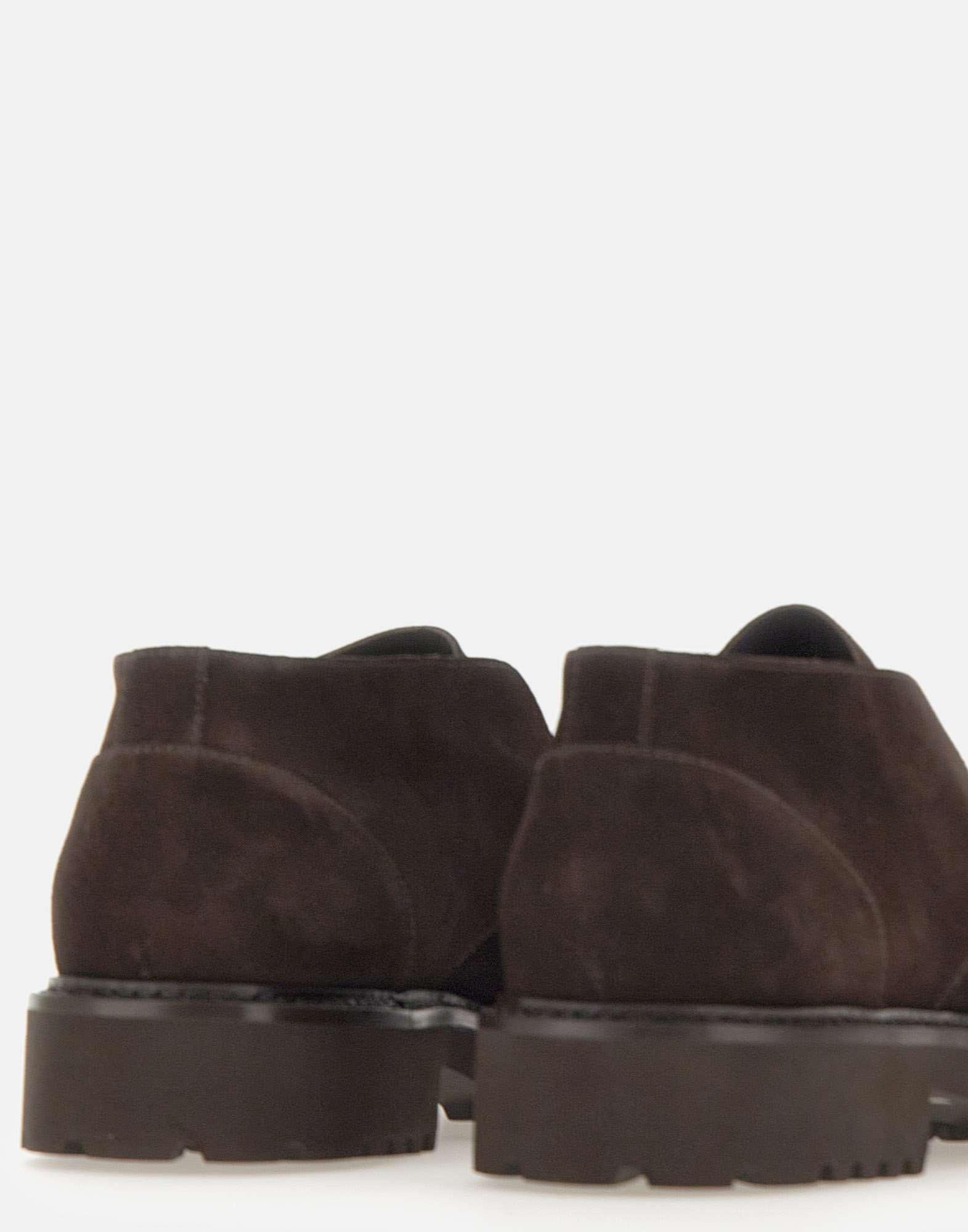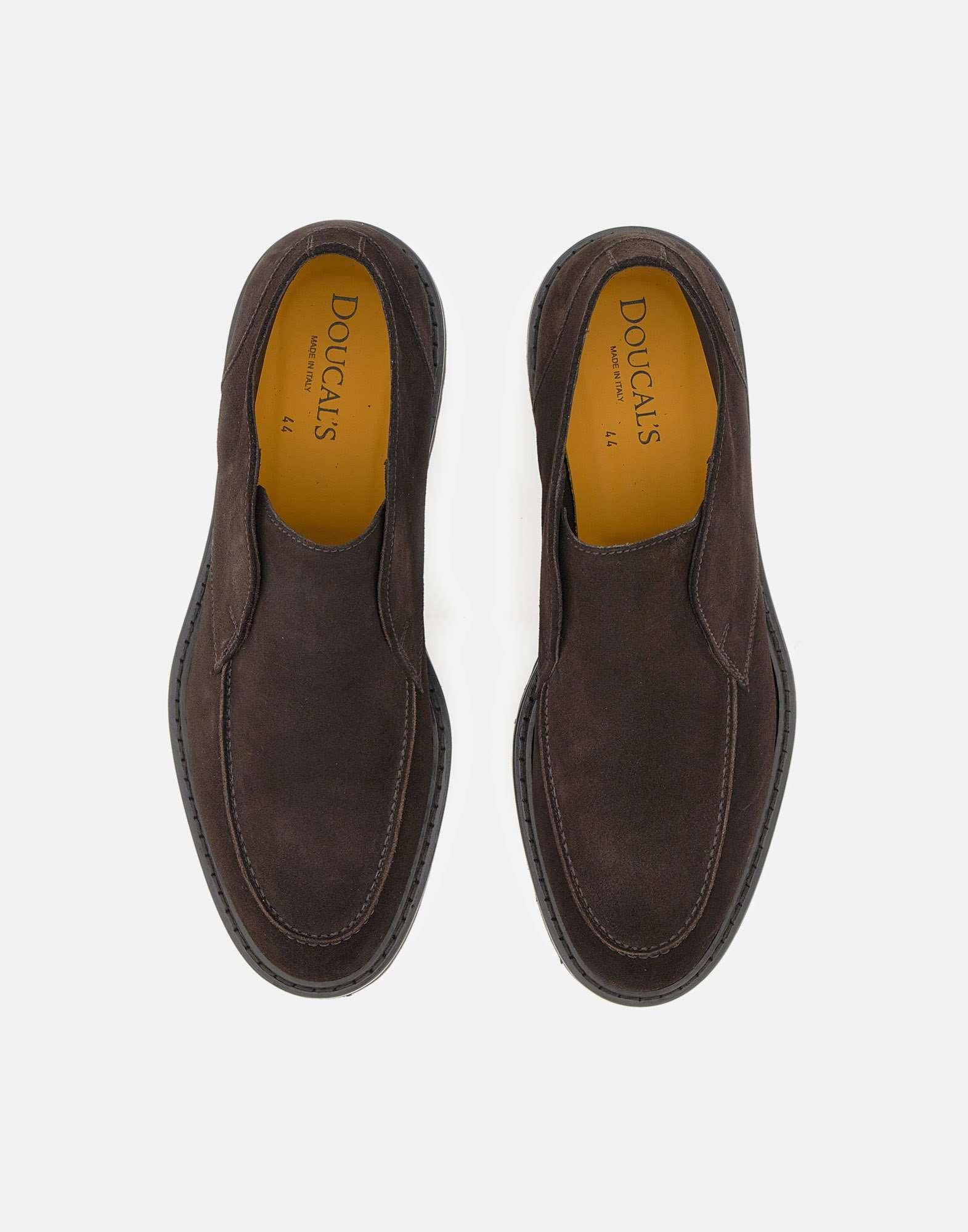 Doucal's "Visone" men's loafers crafted from premium dark brown suede, featuring exposed stitching and a round toe. The rubber lug sole ensures grip and comfort, while the 3.5 cm heel adds a touch of elegance and boldness. Regular fit, perfect for completing both casual and formal looks. Made in Italy. Fabric case included.