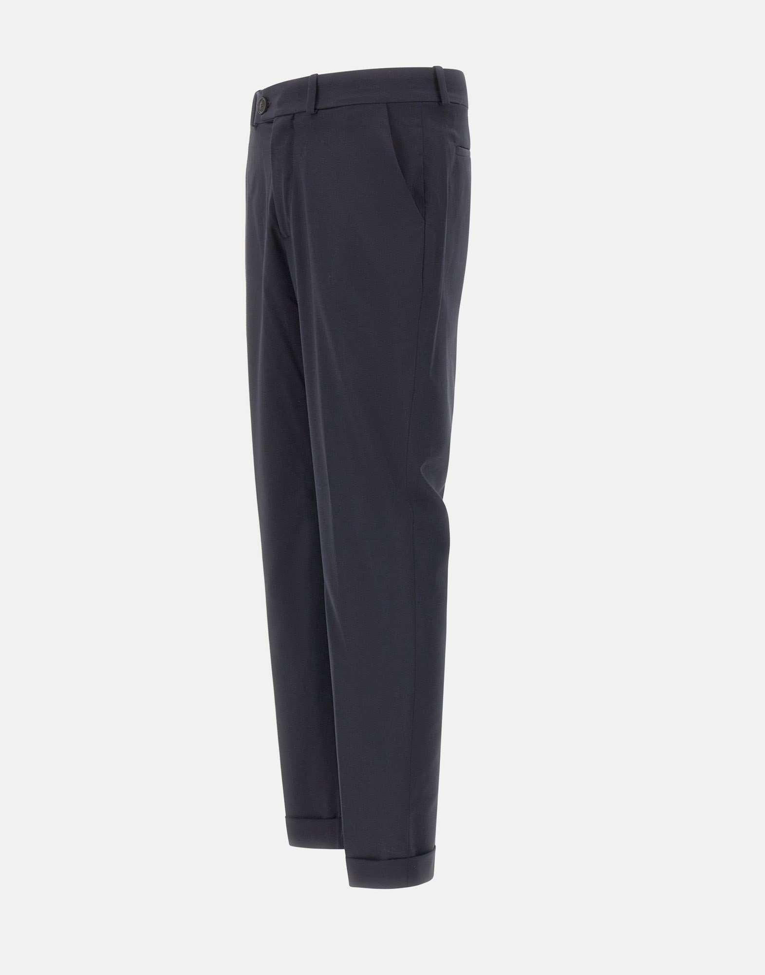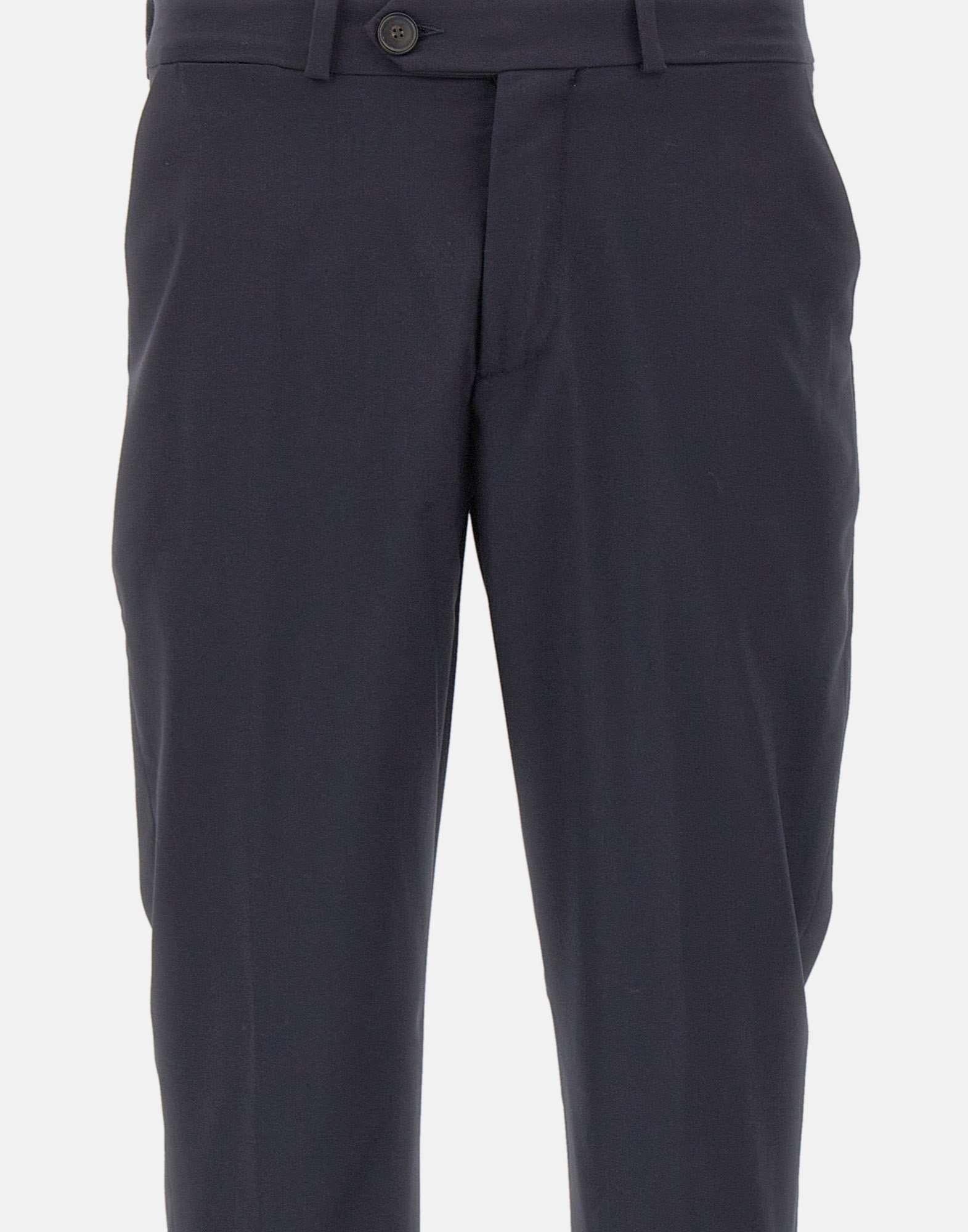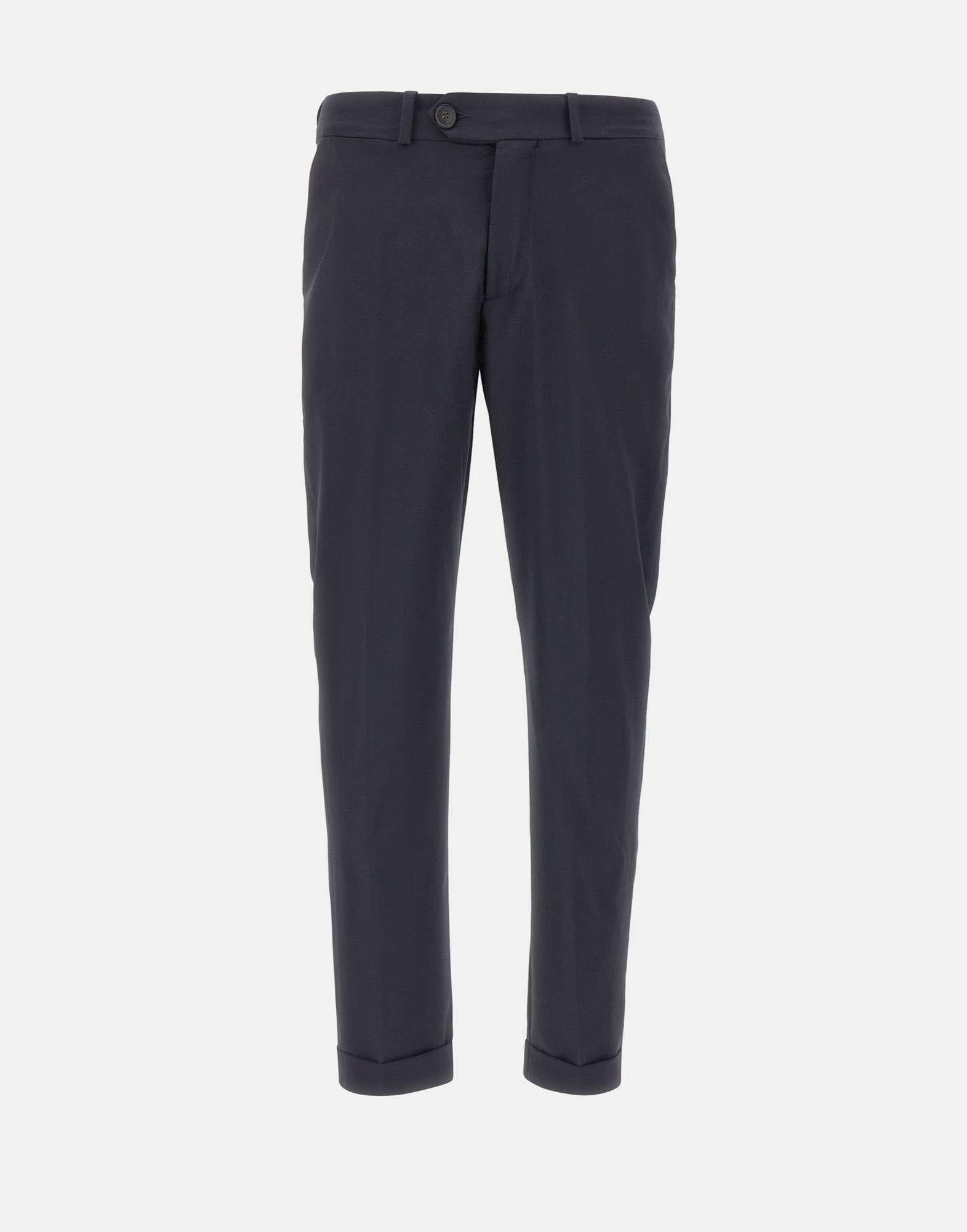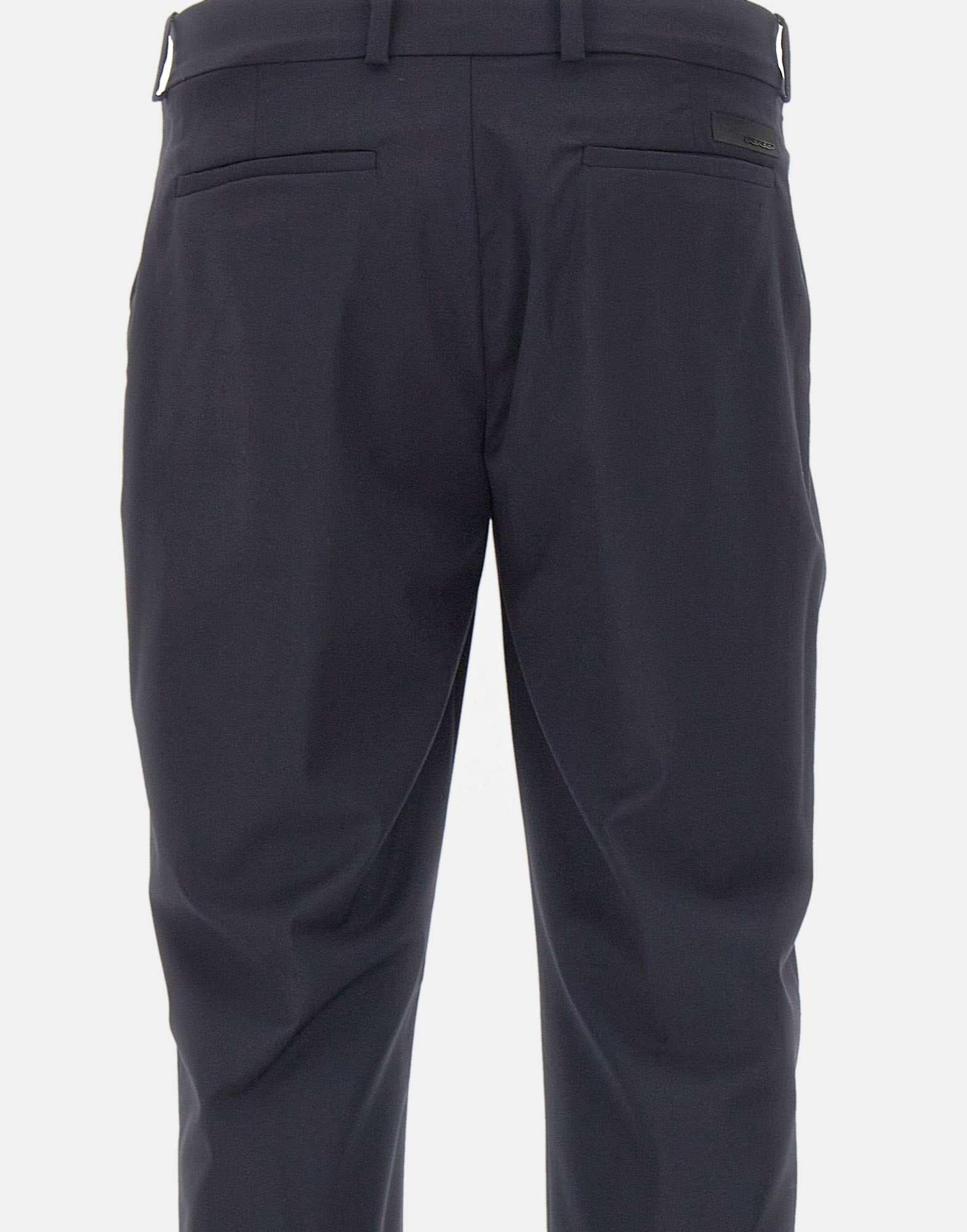 RRD "Summer Wooltech Chino" men's trousers crafted from lightweight technical cool wool in dark blue, a chino style designed to accompany professional days and formal occasions with impeccable elegance throughout the summer season. The wrinkle resistant fabric combines comfort, practicality and a consistently polished look, while the slim fit enhances the clean lines of the design, creating a streamlined and contemporary silhouette. The belt loop waistband is finished with a double horn button closure and a zip concealed by the fly, while inside the tonal band printed with the exclusive Razzle Dazzle monogram adds a sophisticated touch. Side slant pockets provide understated functionality, while the rear welt pockets are enhanced by a black micro injected logo on the right side. The 16 cm hem with cuffed ankle finish completes the style with classic elegance and a tailored character.